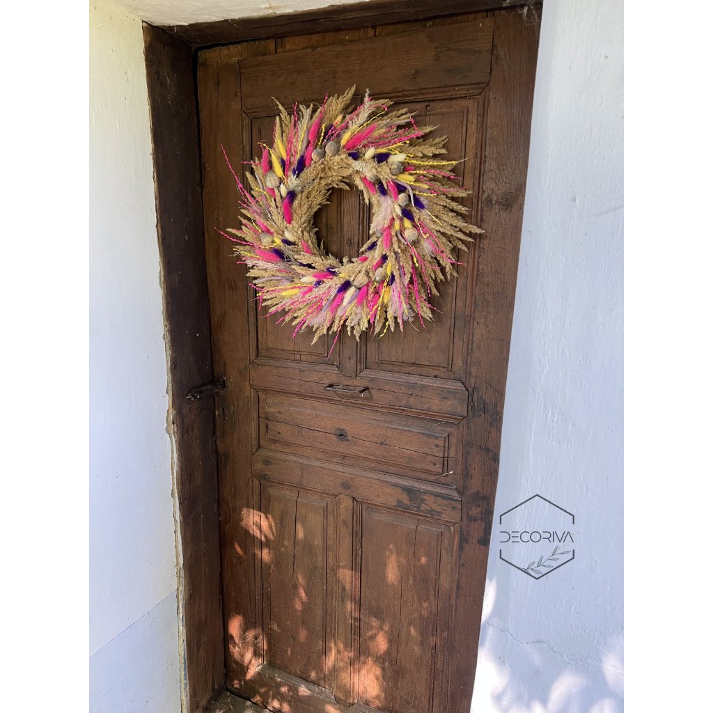 Věnec je tvořen sušenými travinami, makovicemi a pestrými zaječími ocásky v odstínech růžové, žluté a fialové. Nadýchaný a bohatý vzhled, snadná údržba i dlouhá trvanlivost – to jsou hlavní přednosti této dekorace z přírodních i barvených surovin.