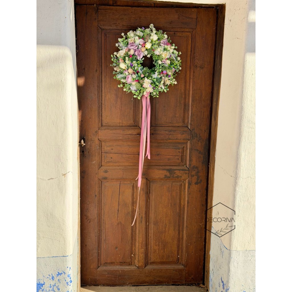 Květinový věnec na dveře ve svěžích jarních barvách. Kombinace barevných květin, eukalyptu a hedvábné stuhy vnáší do vašeho vstupu radost a přírodní svěžest.