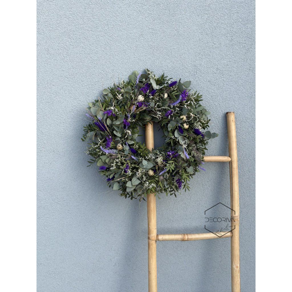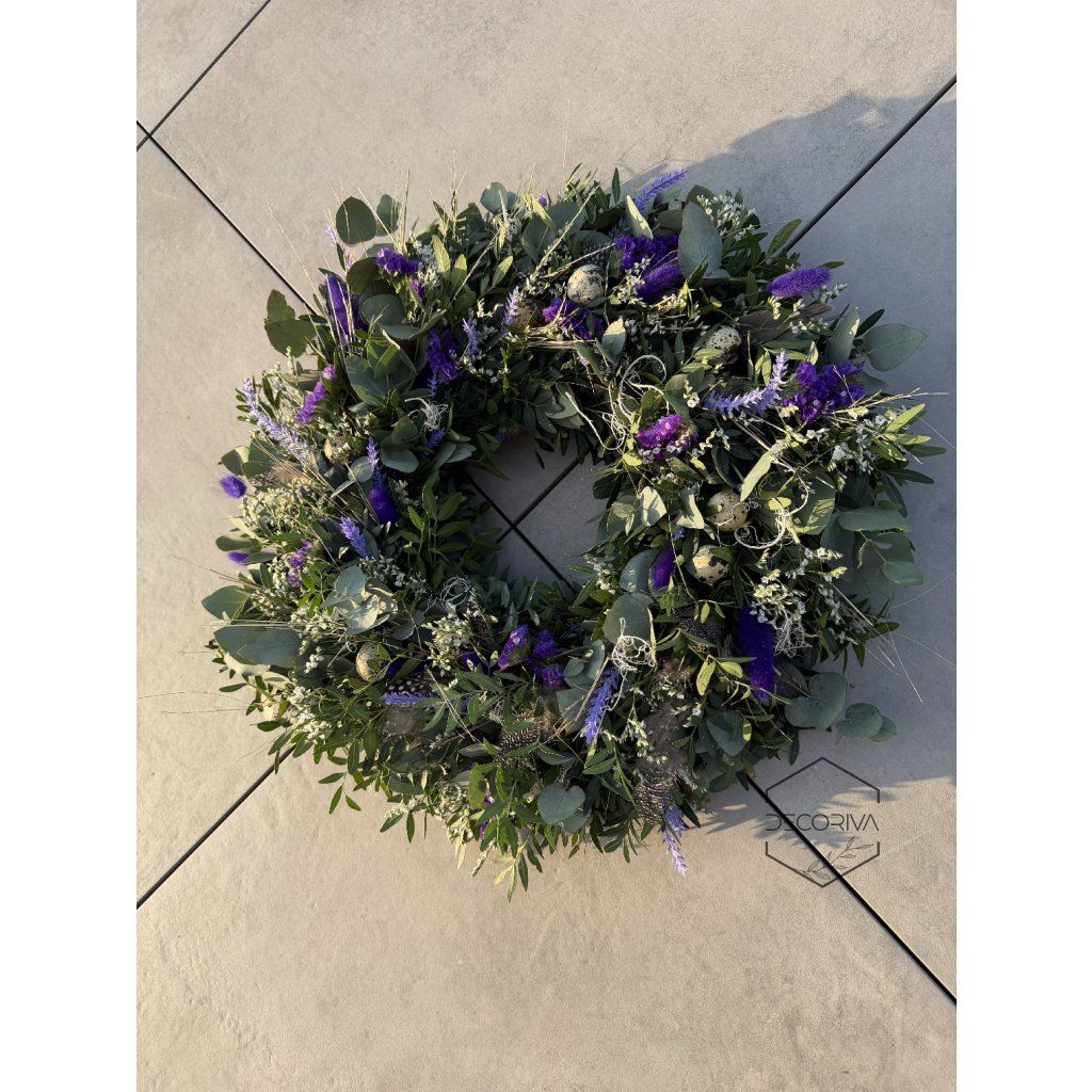 Přírodní fialový věnec - cca 50 cm je bohatě aranžovaná dekorace v odstínech zelené a fialové, doplněná o jemné přírodní detaily. Díky vzdušnému, ale zároveň výraznému vzhledu působí originálně a hodí se na dveře, stěnu i do interiéru.