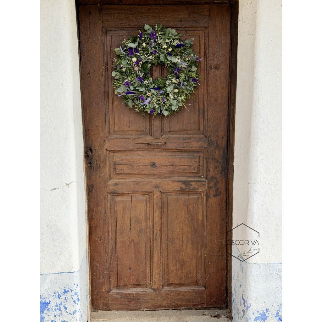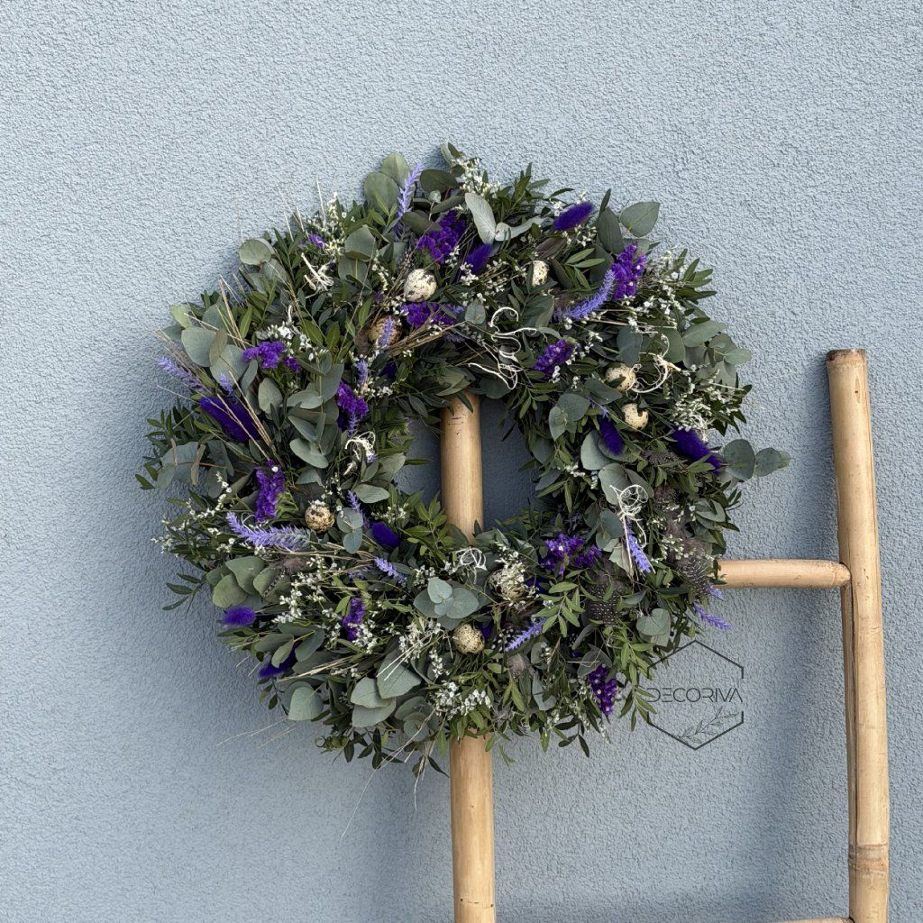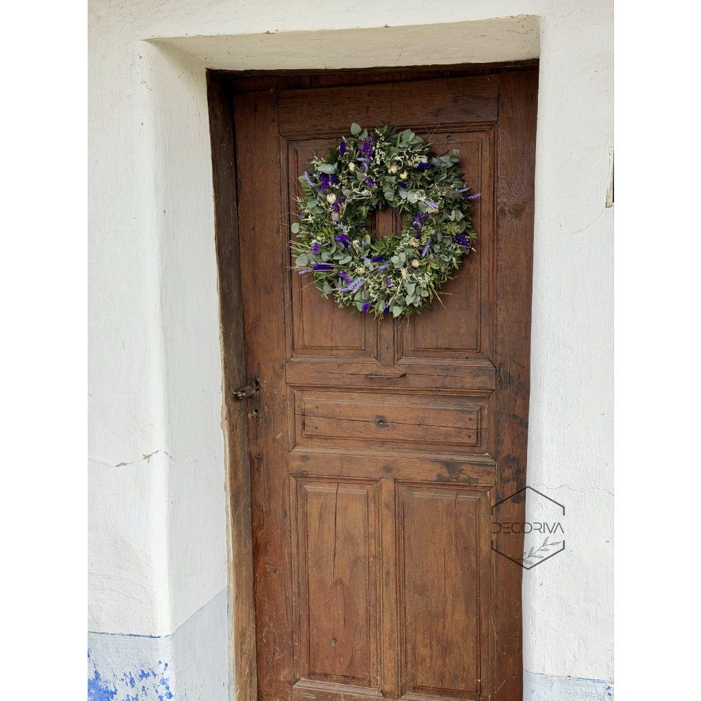 Oživte svůj domov přírodním fialovým věncem - cca 50 cm. Bohatá kombinace zeleně, fialových detailů a jemných přírodních prvků vytváří elegantní dekoraci pro dveře i interiér.