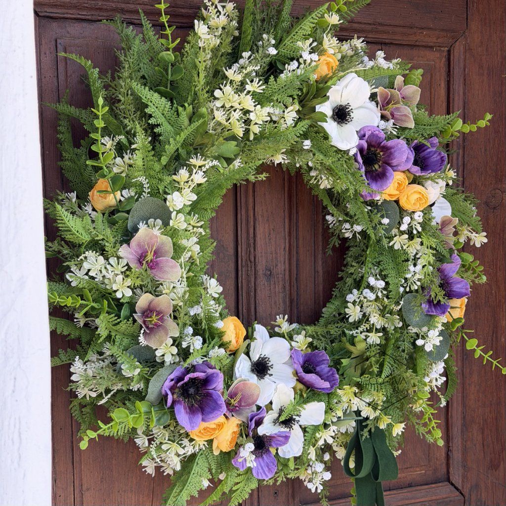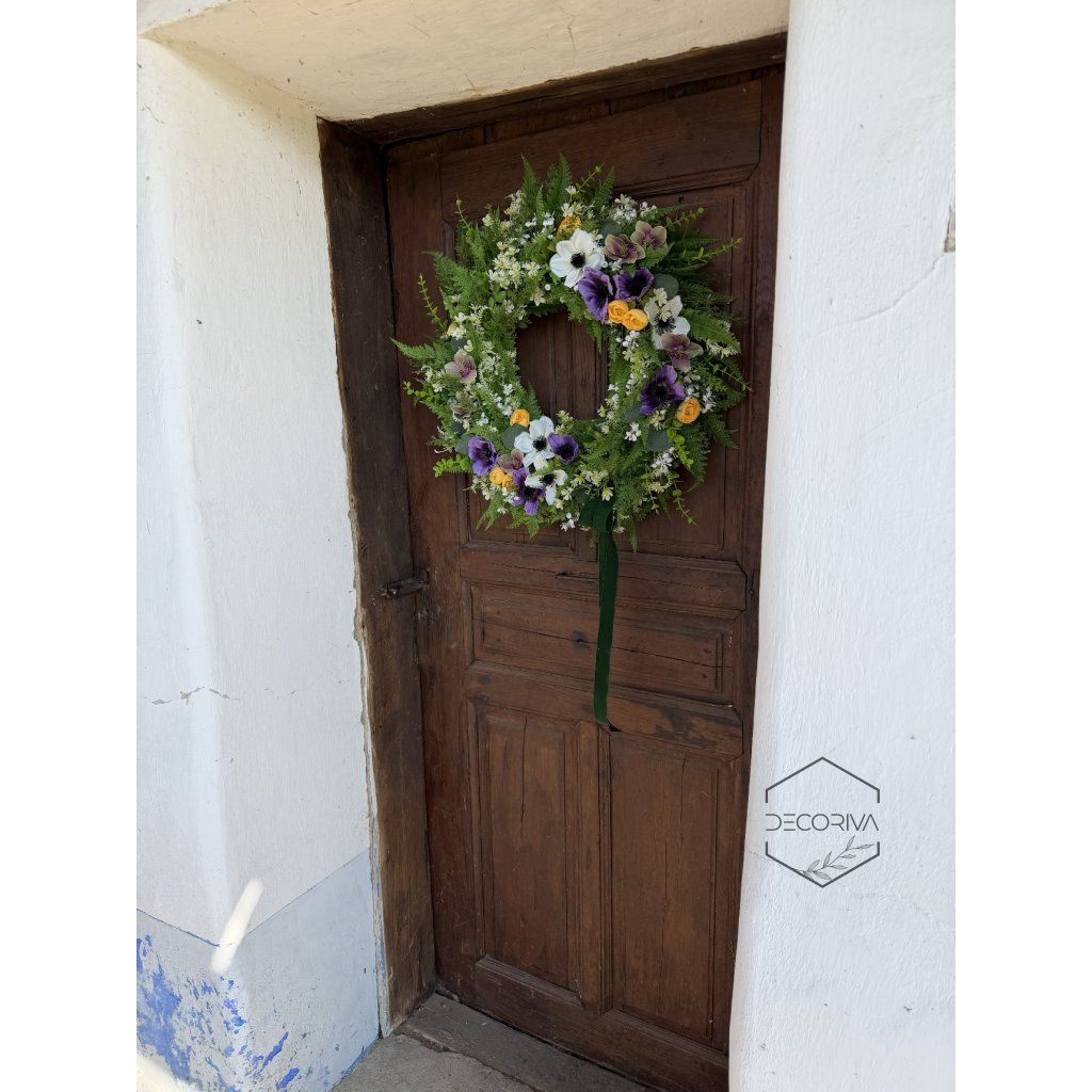 Trvalý barevný věnec - cca 63 cm je radostí pro oči díky harmonické kombinaci bílých, fialových, žlutých a oranžových květů obklopených svěží zelení. S jemnou zelenou stuhou působí svěže a energicky, ideálně pro jarní či letní dekorace dveří, stěn nebo jako výrazný interiérový doplněk.
