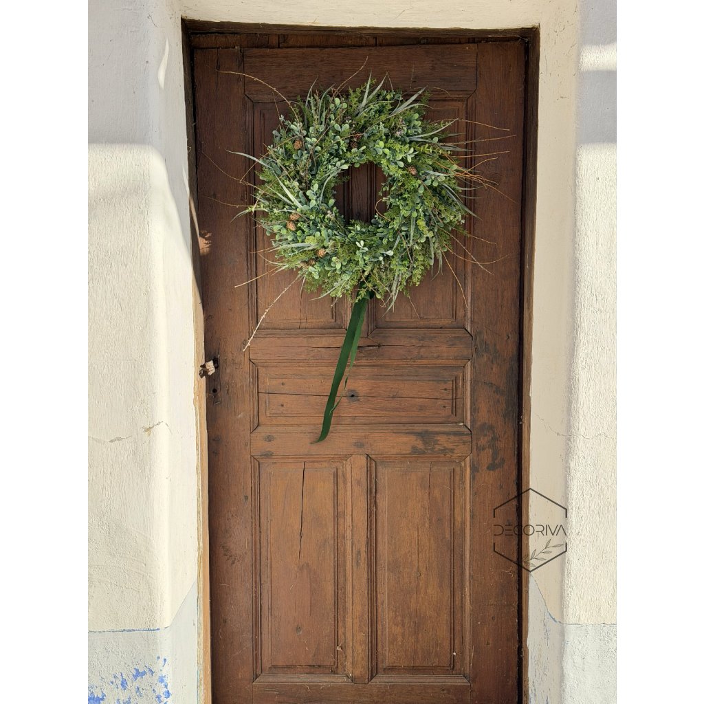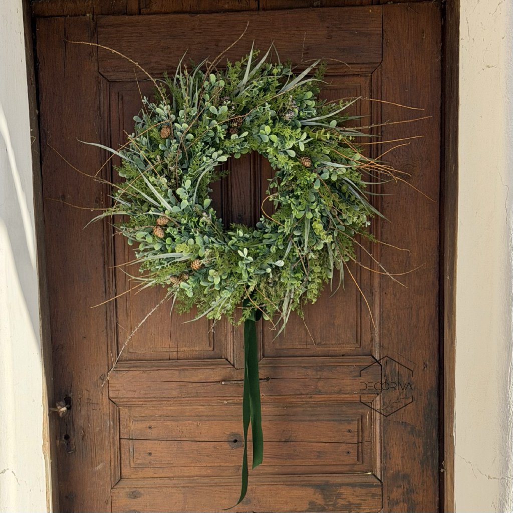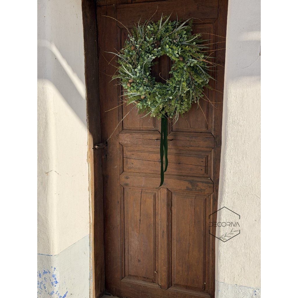 Elegantní trvanlivý věnec z umělé zeleně je nadčasovou dekorací pro vchodové dveře, interiér i kryté venkovní prostory. Kombinace jemných zelených listů, drobných větviček a přírodních detailů vytváří přirozený vzhled, který působí svěže po celý rok – bez nutnosti údržby.
