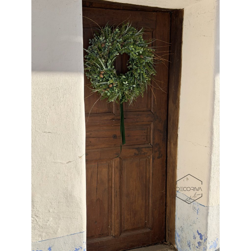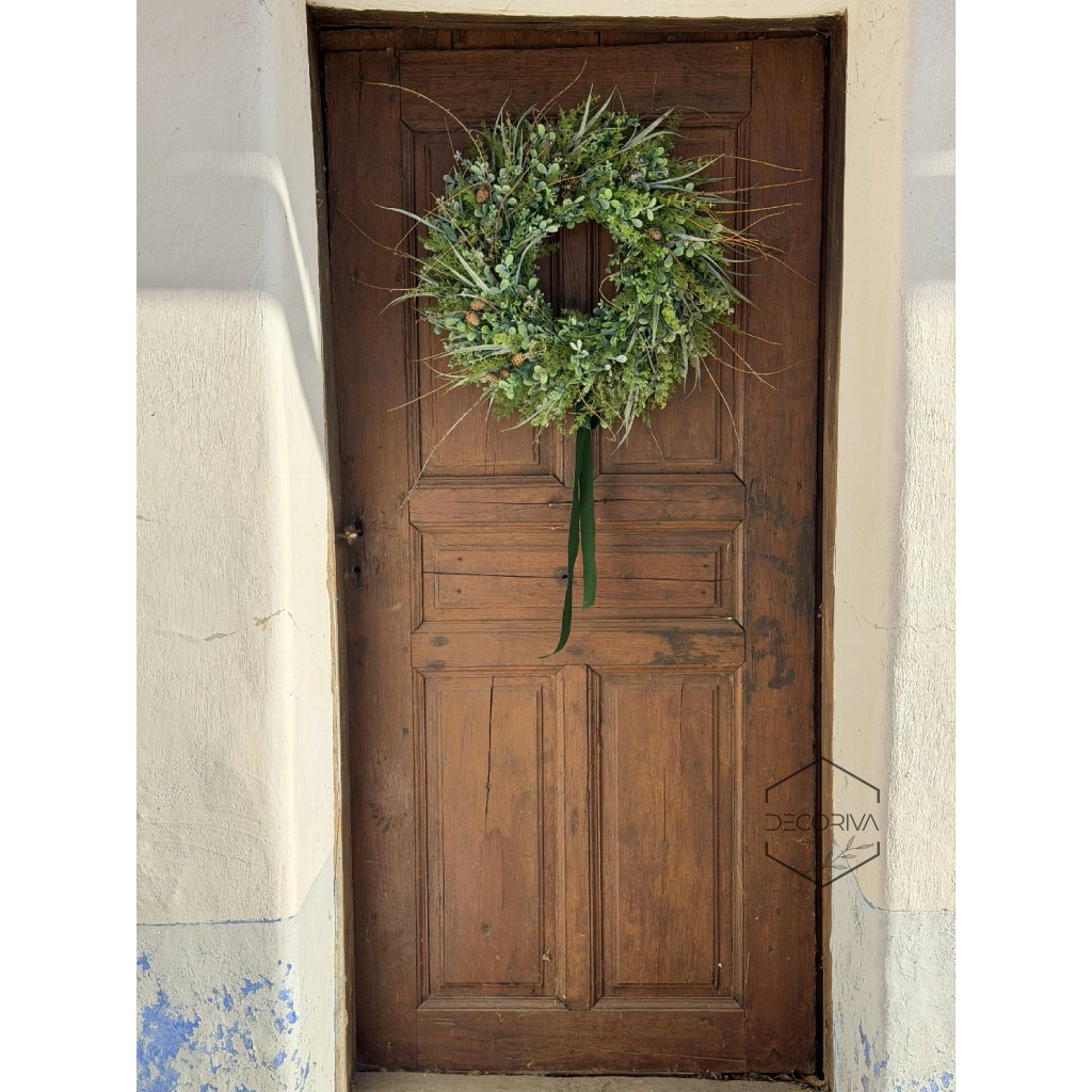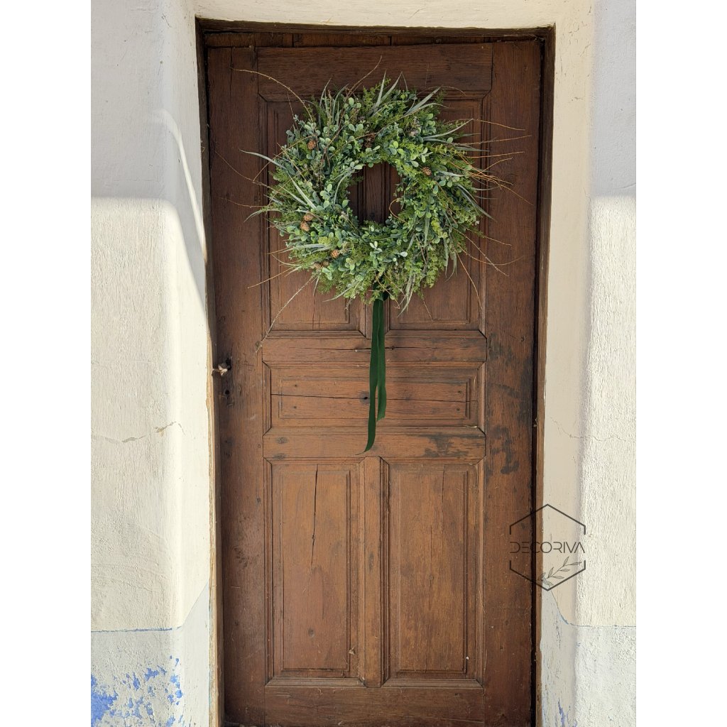 Elegantní trvanlivý věnec z umělé zeleně je nadčasovou dekorací pro vchodové dveře, interiér i kryté venkovní prostory. Kombinace jemných zelených listů, drobných větviček a přírodních detailů vytváří přirozený vzhled, který působí svěže po celý rok – bez nutnosti údržby.