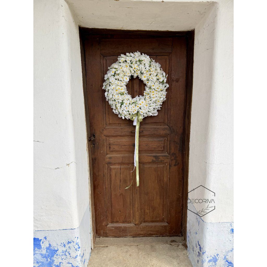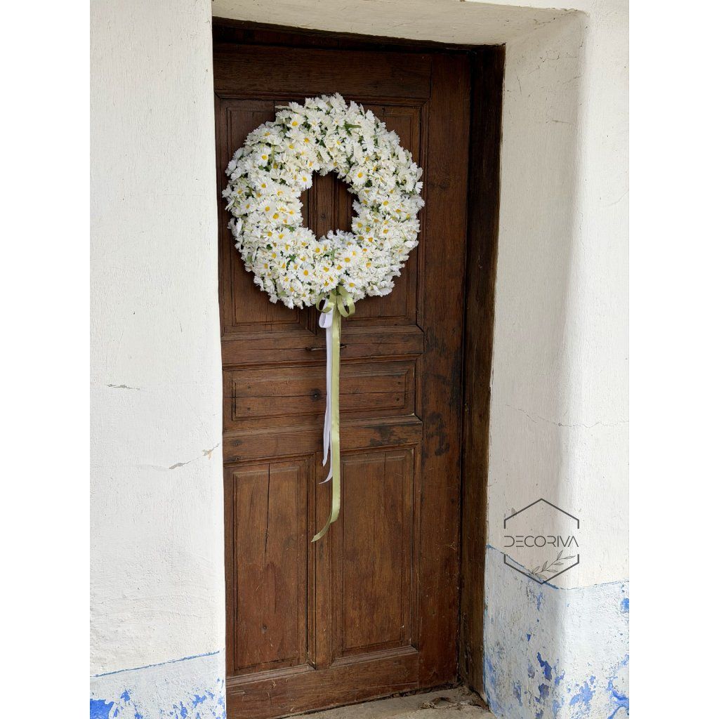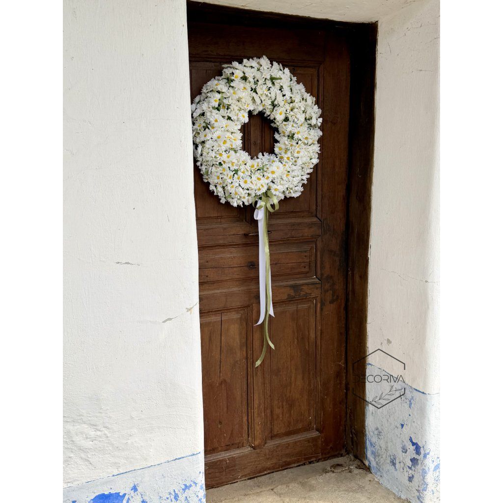 Oživte svůj domov trvanlivým kopretinovým věncem - cca 58 cm. Čistě bílá dekorace s elegantní stuhou pro svěží a nevinný vzhled na dveřích či v interiéru.