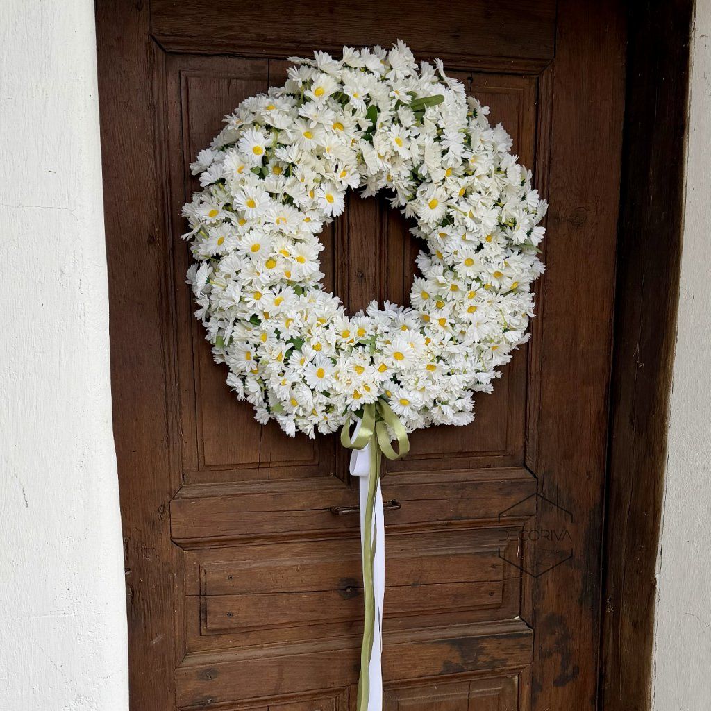 - Materiál: umělé kopretiny, zelené listy, bílá saténová stuha