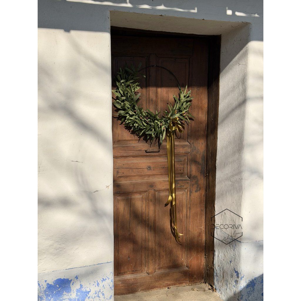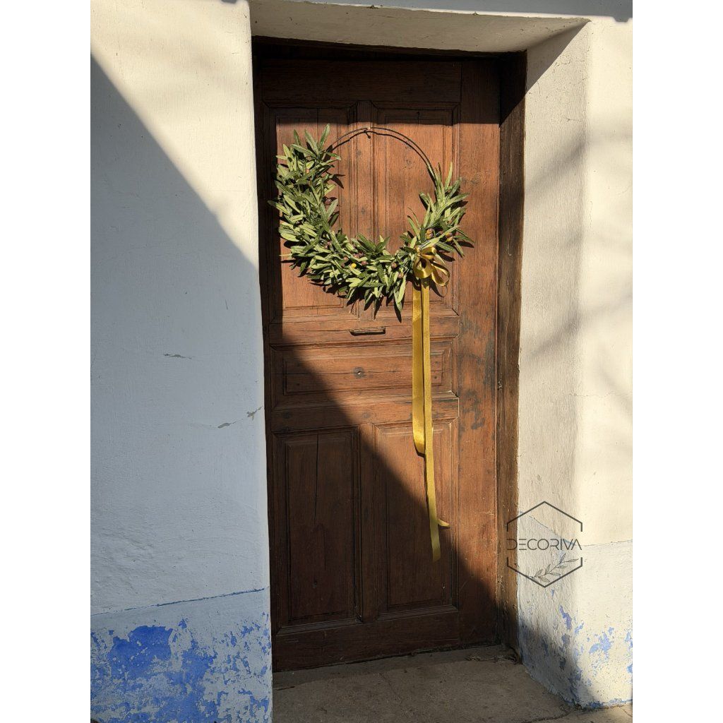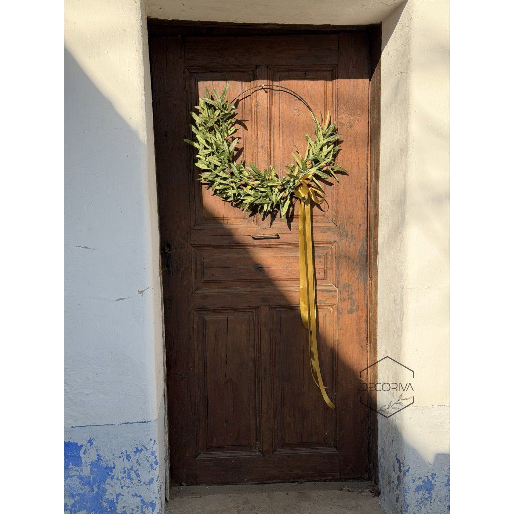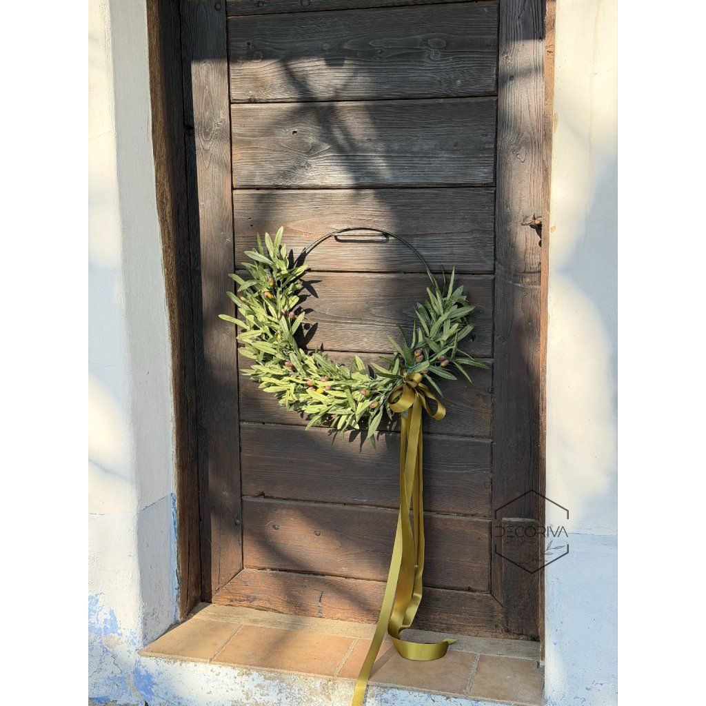 Oživte svůj domov středomořským olivovým věncem - cca 55 cm. Zelené listy s olivami a stuhou pro autentickou atmosféru na dveřích či terase.