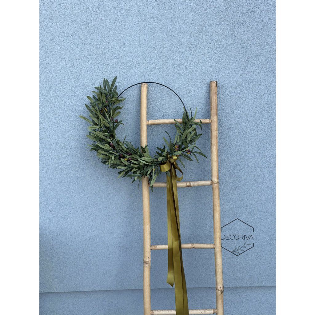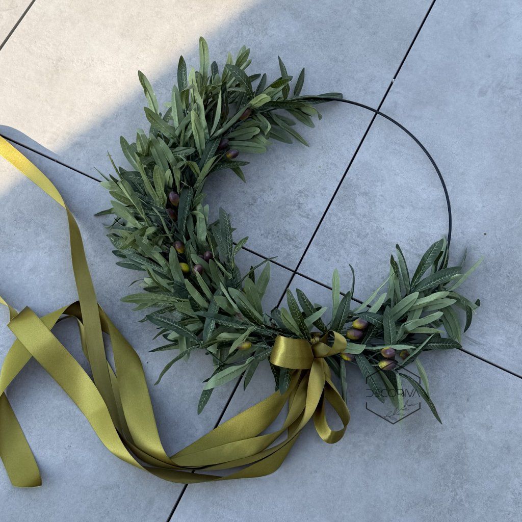 - Materiál: umělé olivové větve s listy, dekorativní olivy, saténová stuha
