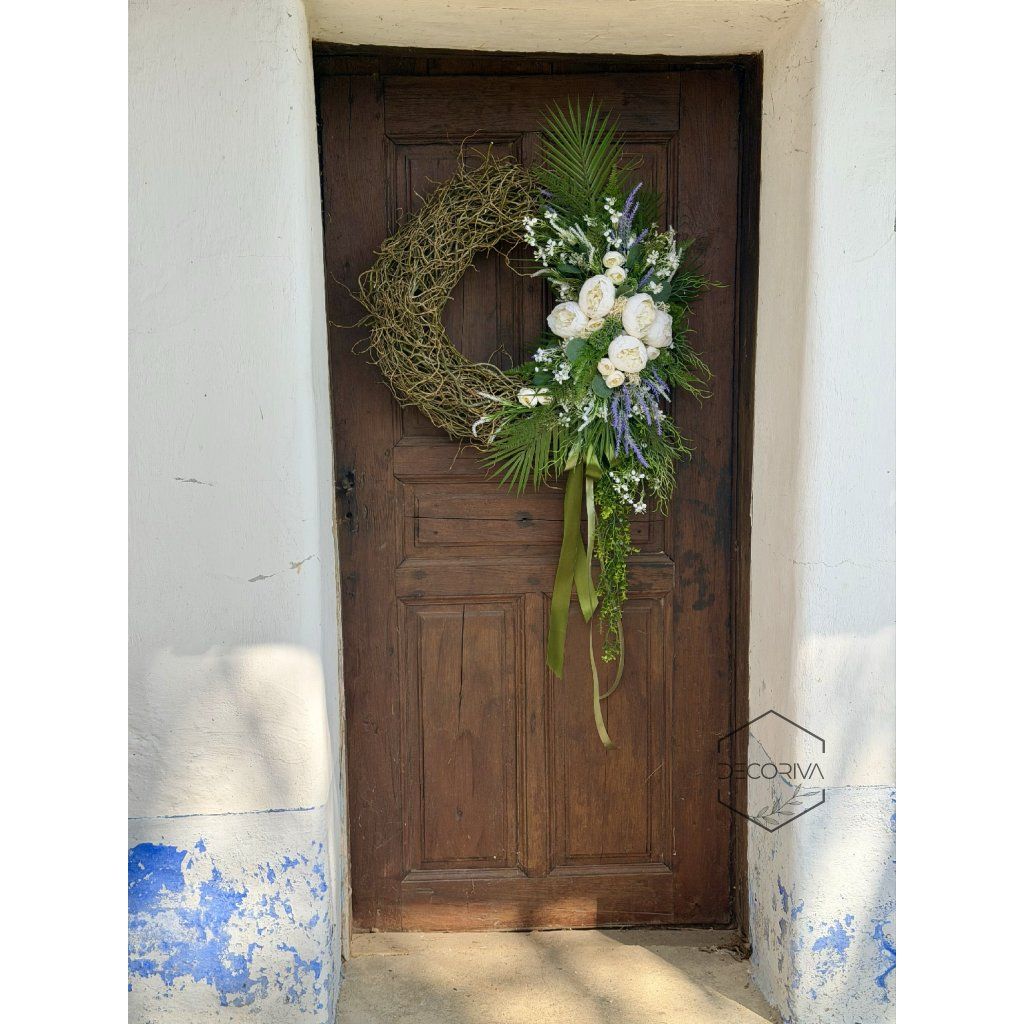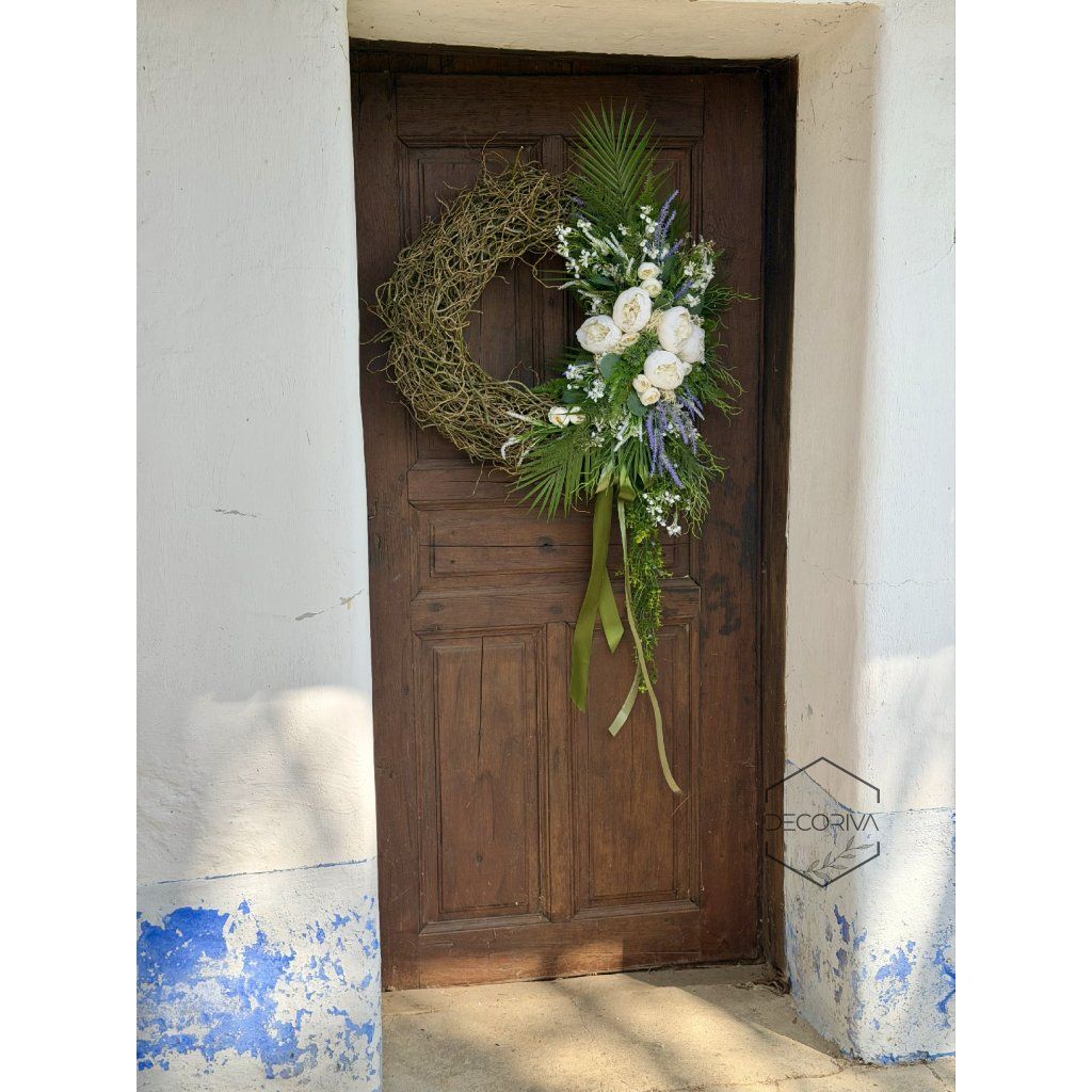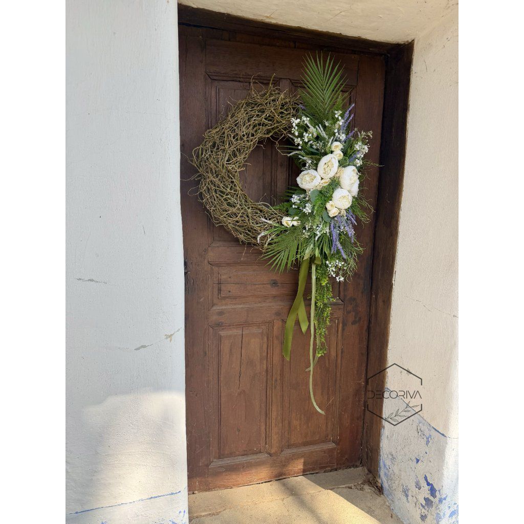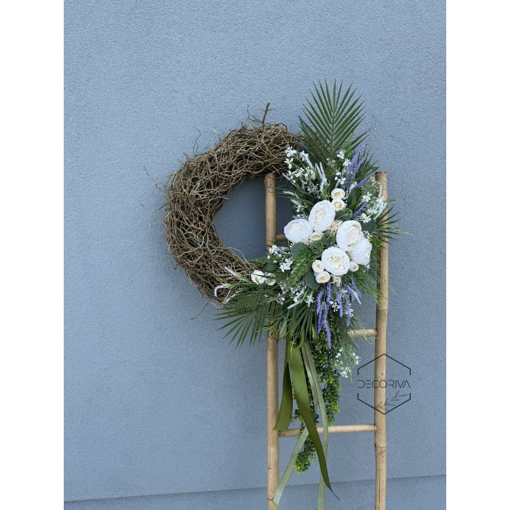 Trvanlivý věnec na proutěném korpusu - 115 x 75 cm je výrazná dekorace s přírodním základem, bohatým aranžmá a elegantním splývavým zakončením. Kombinace bílých květů, zeleně, jemných travin a proutěného korpusu vytváří luxusní a zároveň přirozený vzhled, který vynikne na vstupních dveřích, v hale i ve velkých interiérech.