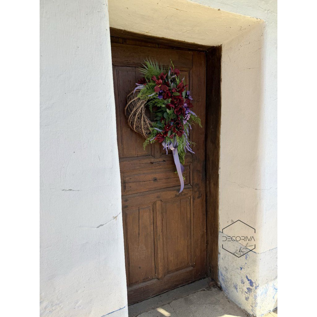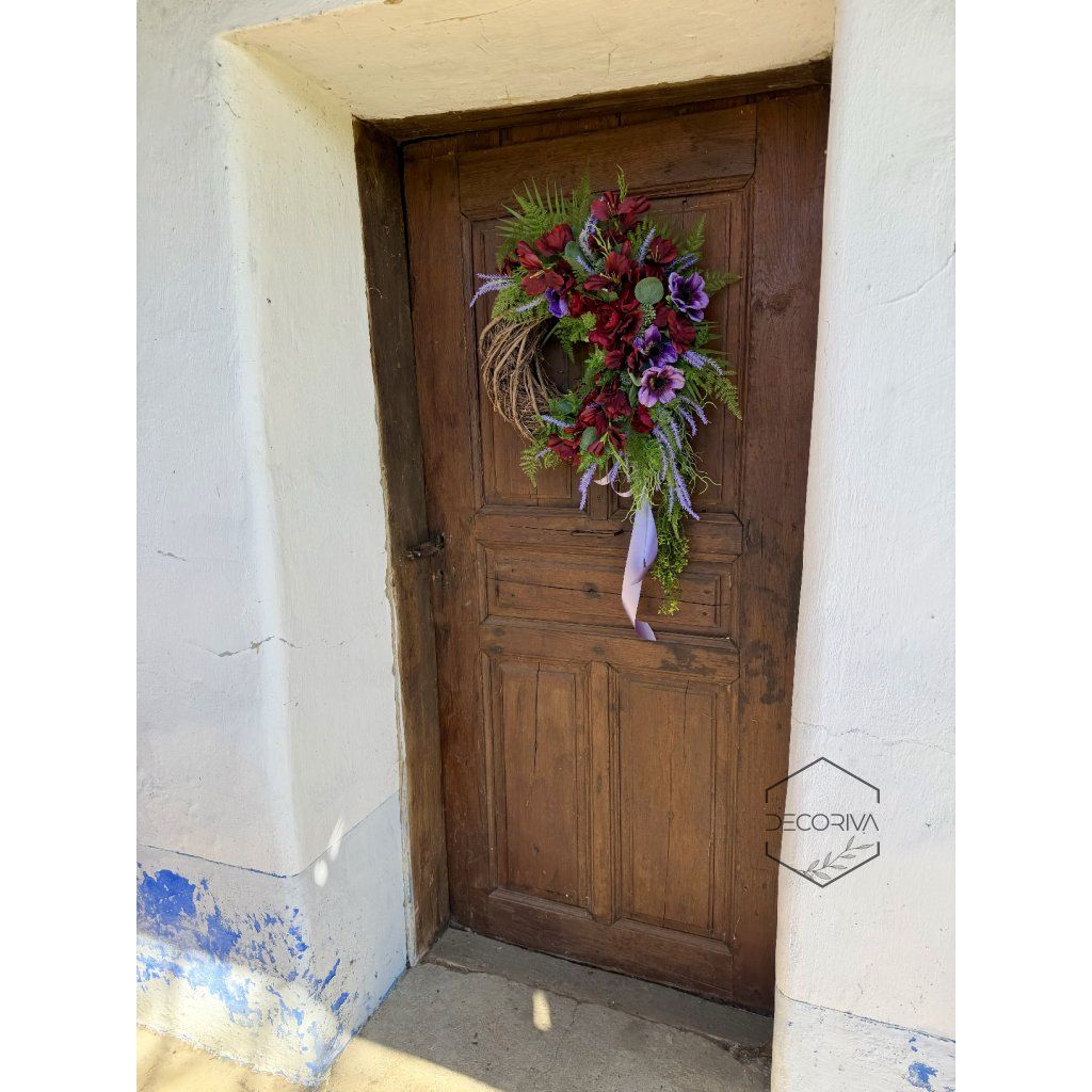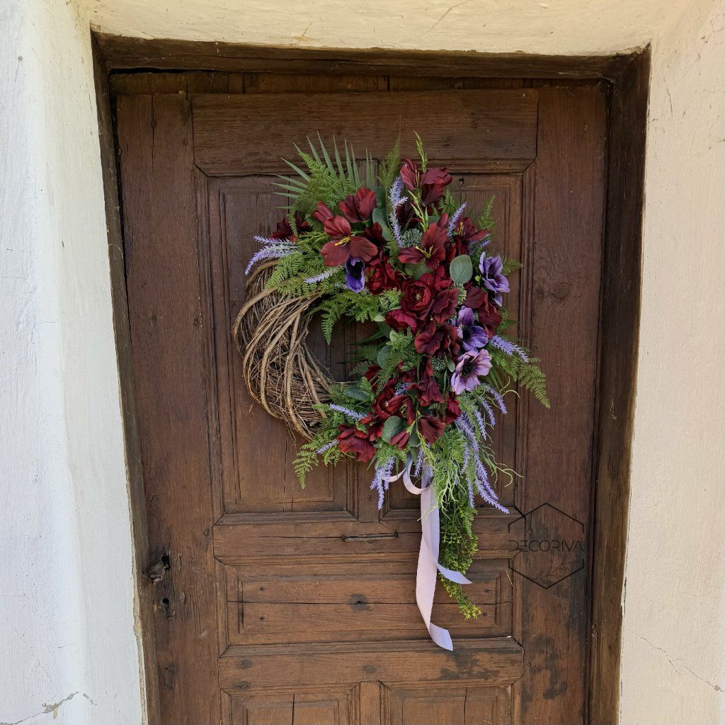 Trvanlivá dekorace na proutěném korpusu - šířka cca 55 cm, výška cca 90 cm působí bohatě, elegantně a velmi dekorativně. Kombinace vínových květů, jemné zeleně, levandulových tónů a přírodního proutěného základu vytváří harmonický celek, který se hodí na dveře, stěnu nebo jako výrazný prvek v interiéru.