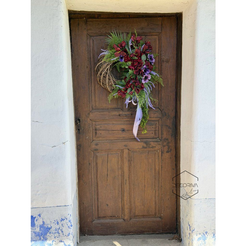 Oživte svůj domov trvanlivou dekorací na proutěném korpusu - šířka cca 55 cm, výška cca 90 cm. Výrazné spojení vínových květů, zeleně a dlouhého splývavého detailu vytváří originální dekoraci na dveře i do interiéru.