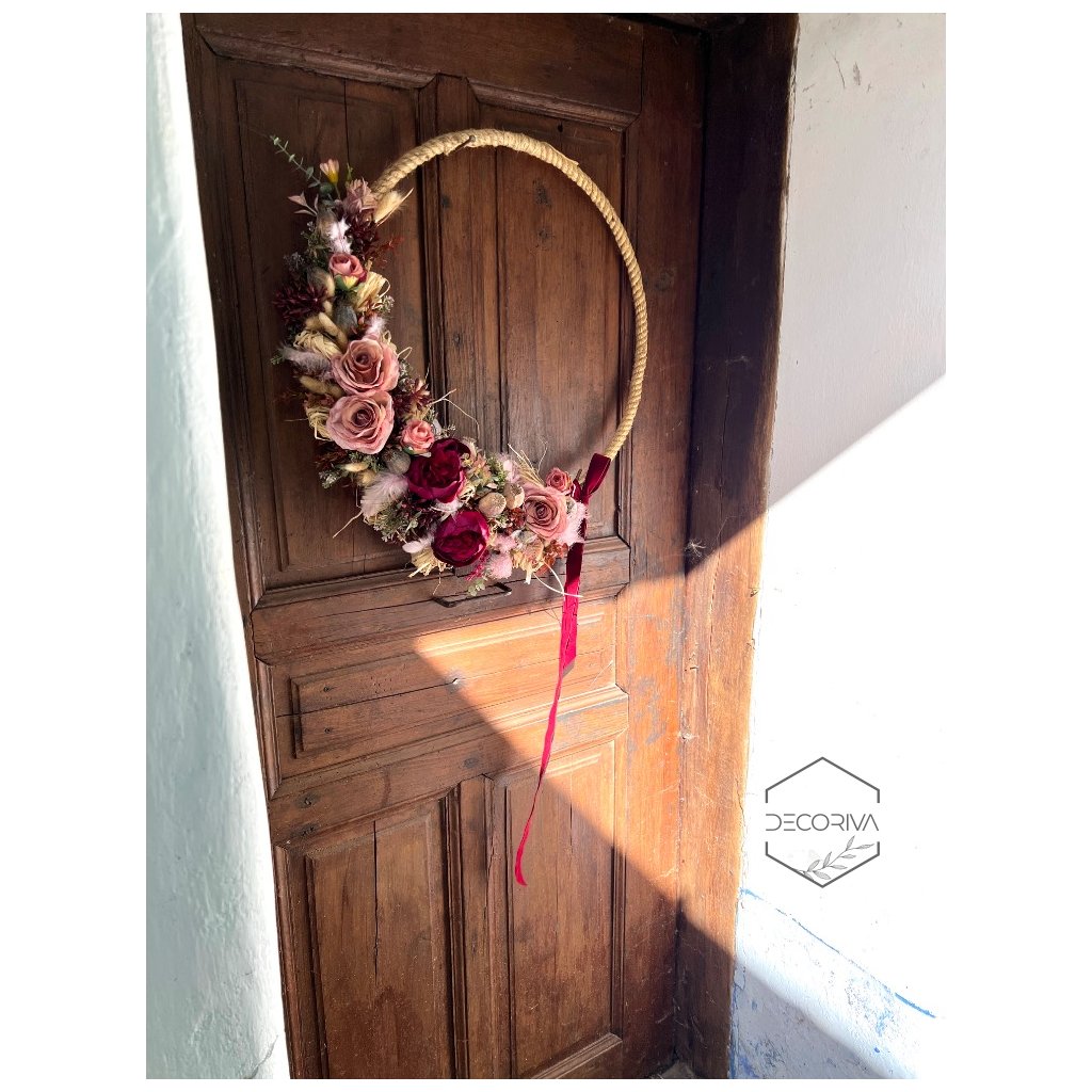 Tento věnec je ručně aranžovaný na pevném lanovém kruhu o průměru 50 cm, výrazný díky syté sametové mašli. Zdobí jej umělé květiny, přírodní makovice, lýko a peříčka, což dohromady vytváří bohatý a efektní vzhled. Přesah dekorací až na 60 cm dodává věnci vzdušnost a výjimečný rozměr. Vhodné jako dekorace do moderního i rustikálního interiéru.