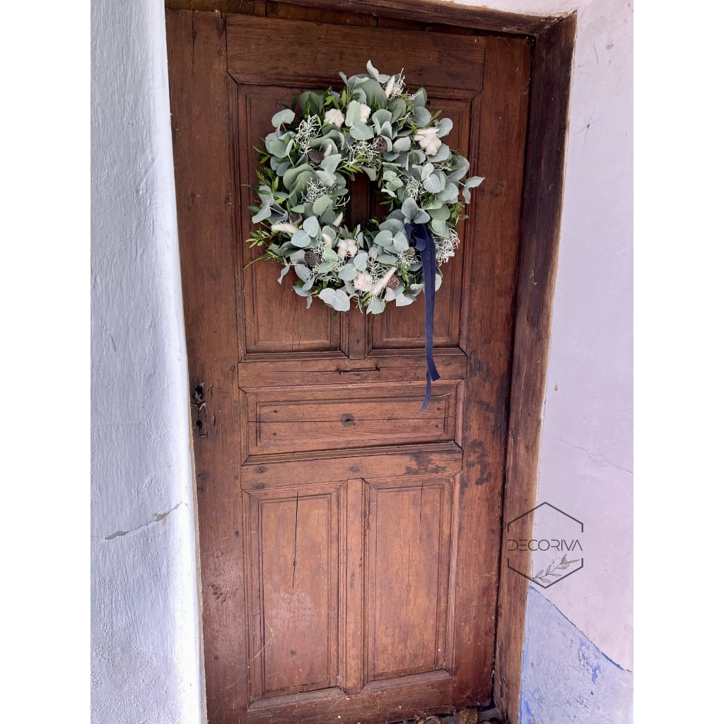 Tento věnec vynikne kombinací syté zeleně, stříbřitých odstínů eukalyptu, jemného drátovce, exotických tobolek lotusu a nevšedního akcentu díky bílým chomáčkům bavlníku a nadýchaným zaječím ocáskům. Tmavě modrá mašle dodává dekoraci elegantní kontrast a slavnostní charakter.