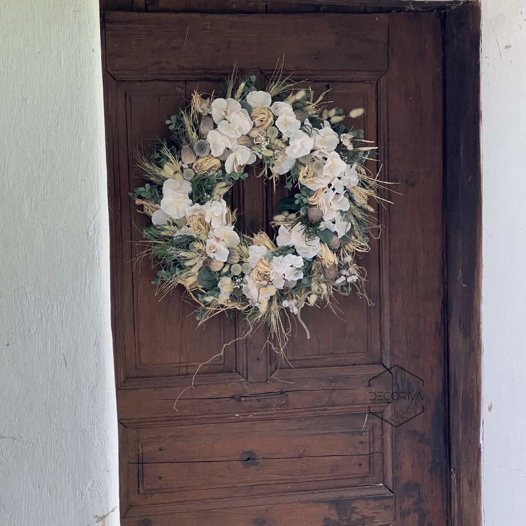 Precizně zpracovaný věnec kombinuje krémové hortenzie, makovice, eukalyptus a směs sušených travin i bodláků. Jemné, zemité barvy a bohatý objem přispívají k všestrannému využití v každé domácnosti – ideální na vstupní dveře, do předsíně i na svátečně prostřený stůl.