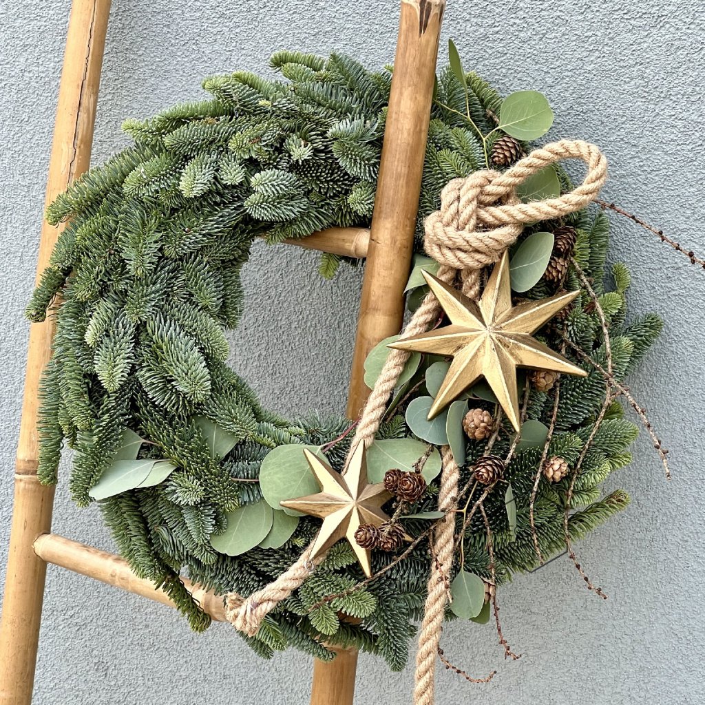 - Materiál: Jedle nobilis, eukalyptus, modřínové větvičky a šišky, dvě patinované/zlaté hvězdy, přírodní dekorativní lano