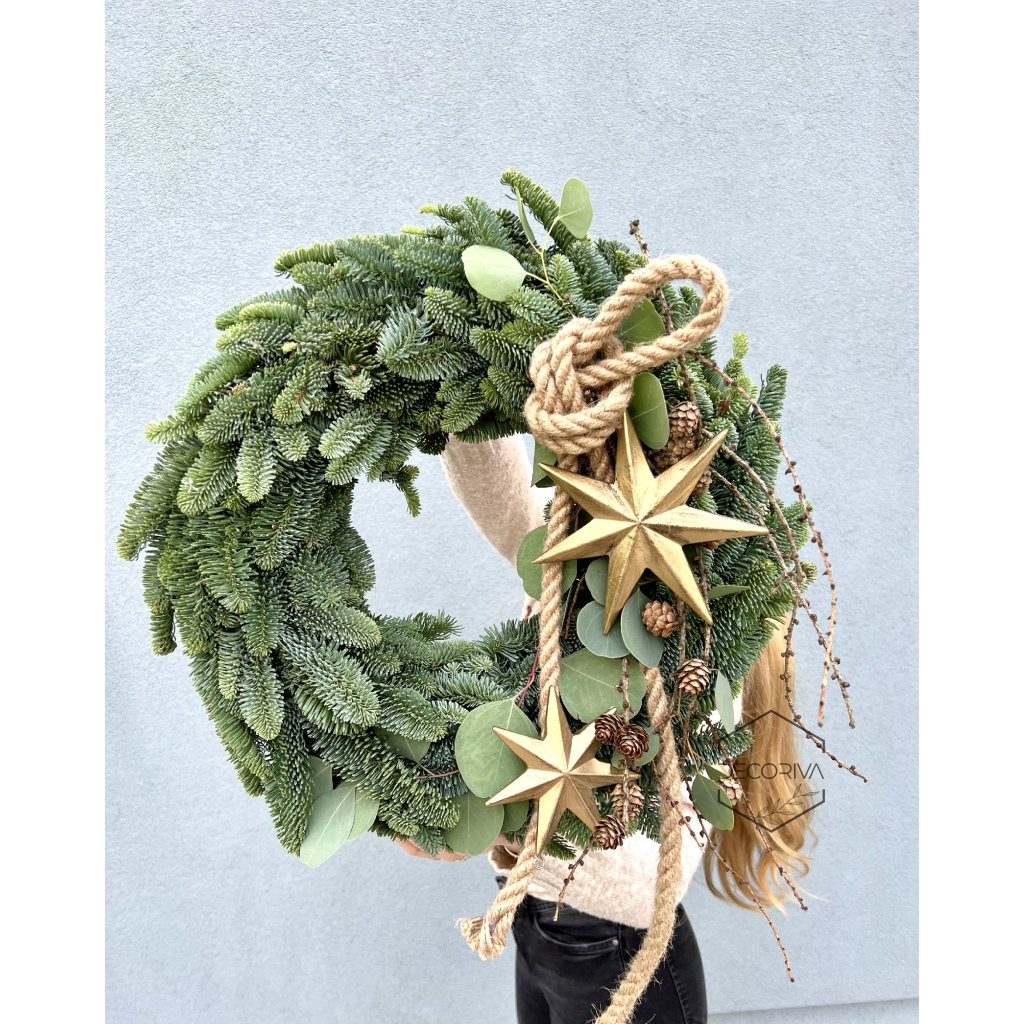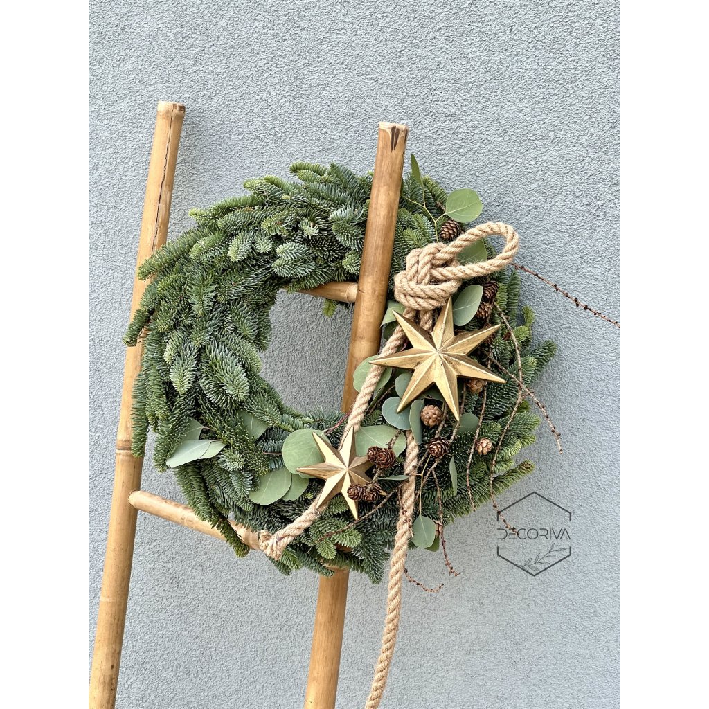 Věnec je vázán z husté jedle nobilis a doplněn větvemi eukalyptu, modřínovými šiškami a drobnými větvičkami. Dominantou jsou dvě výrazné zlaté/patinové hvězdy a robustní dekorativní lano, které umocňuje přírodní a autentický pocit celého aranžmá. Jemné akcenty bez zbytečných barev podtrhují luxusní jednoduchost a působí univerzálně na jakýkoliv typ vstupních dveří či stěny.